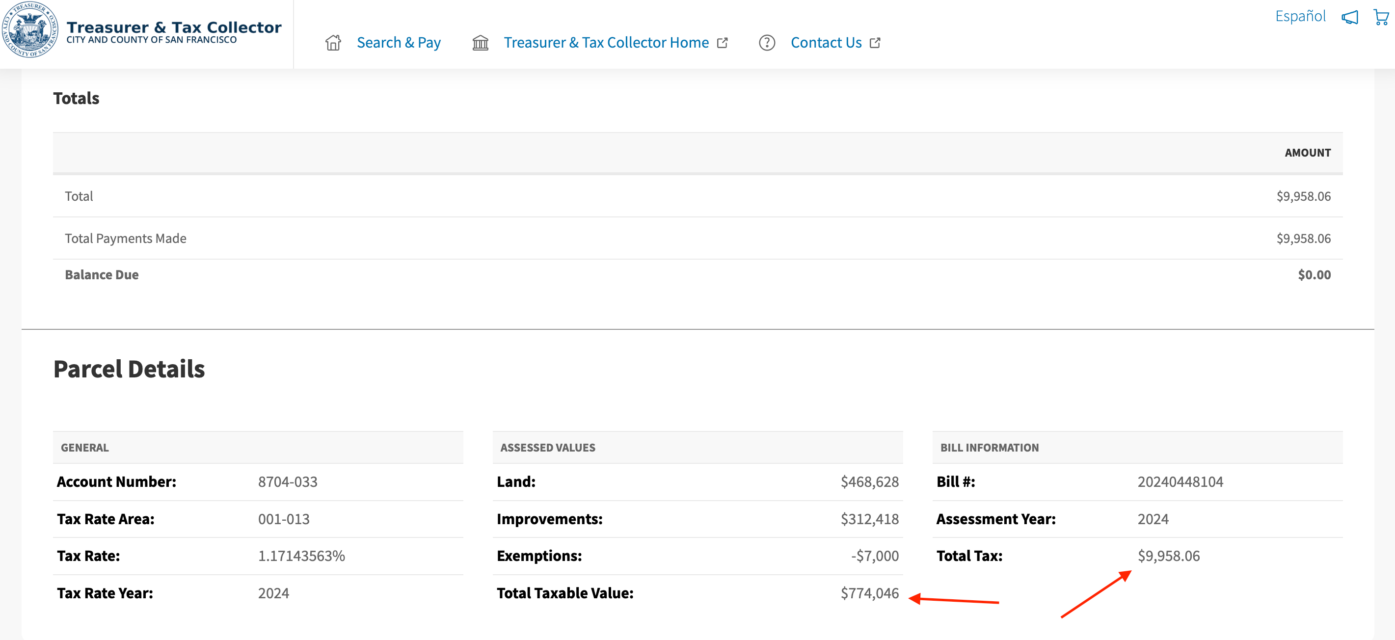 Go to the SF Treasurer’s Office website and type in your address. Look up your tax bill and make a note of your Total Taxable Value, Total Tax, and the two installment due dates at the top (usually mid-April and mid-December):