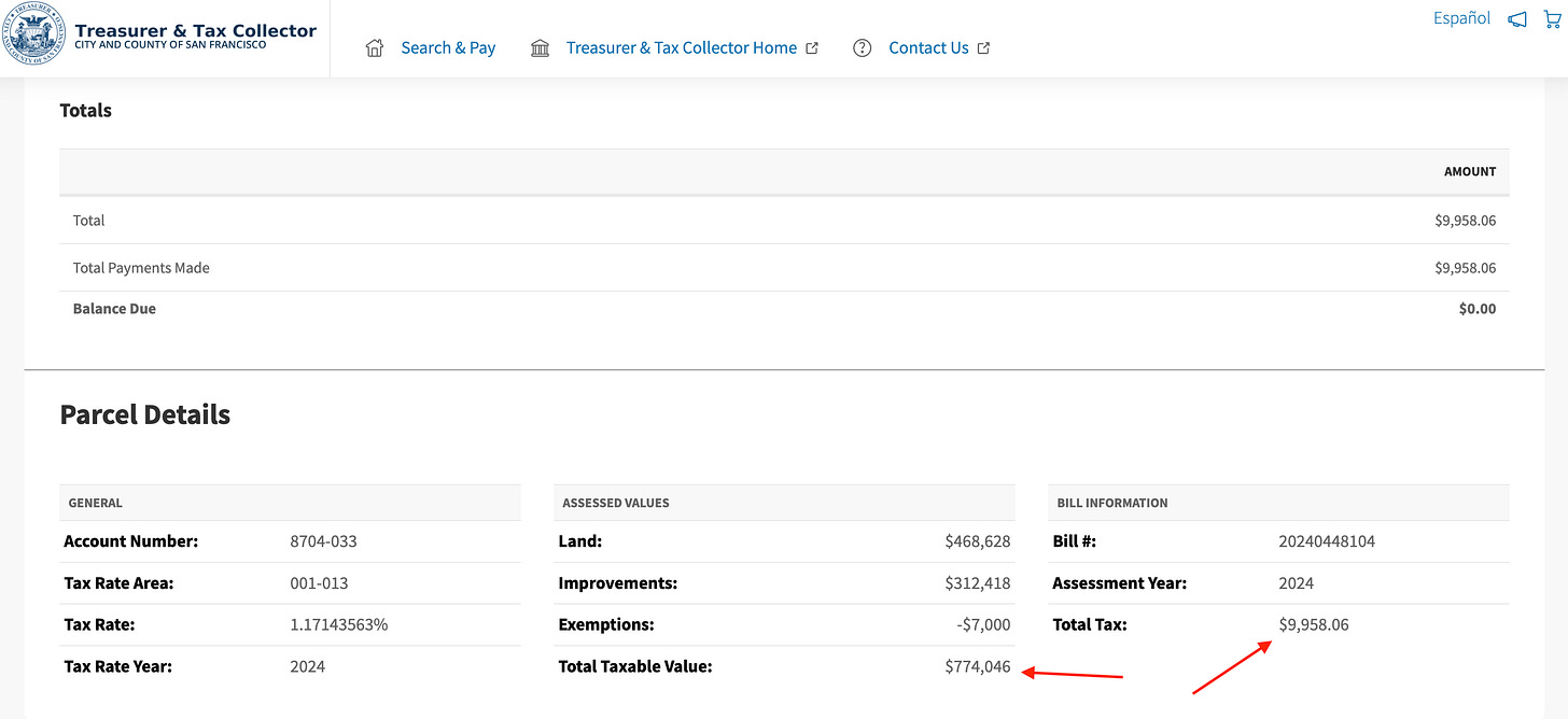 Quick detour: did you notice the $7,000 exemption right above the Total Taxable Value on my tax bill above? Every homeowner living in their home in SF should have this. If not, do it. Stop reading. Do it now. It can even be emailed. Here’s the form and the website to file it. Even if you miss the Feb 15 “deadline,” you can still receive 80% of this value.